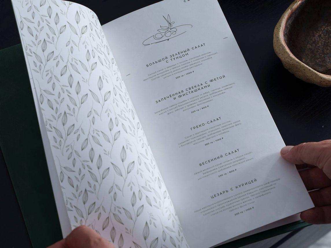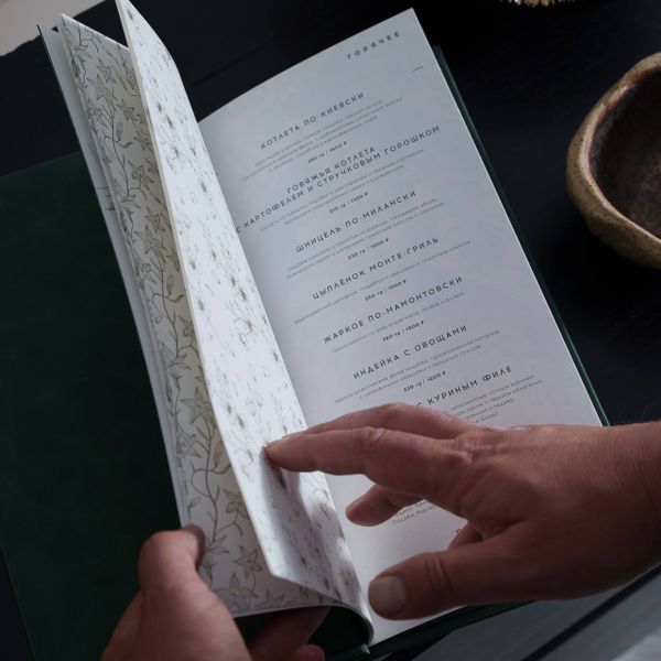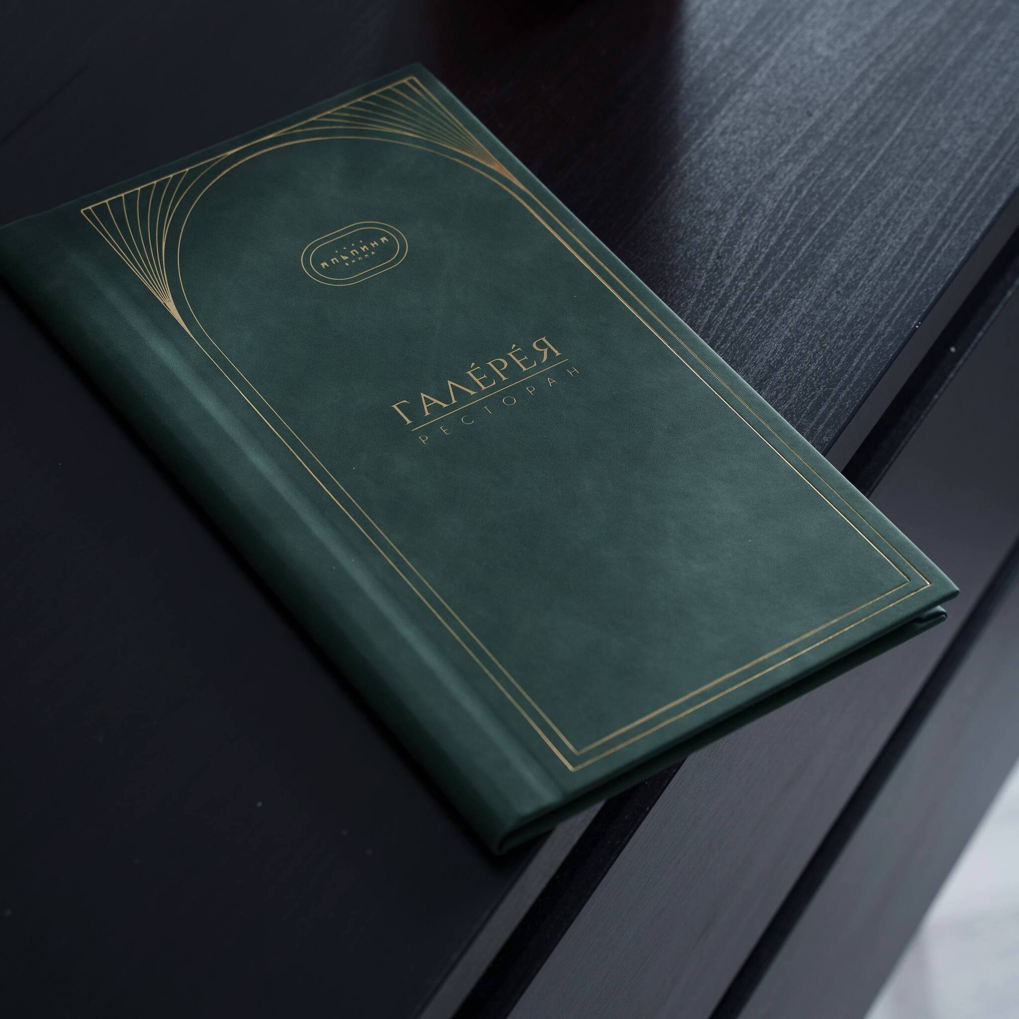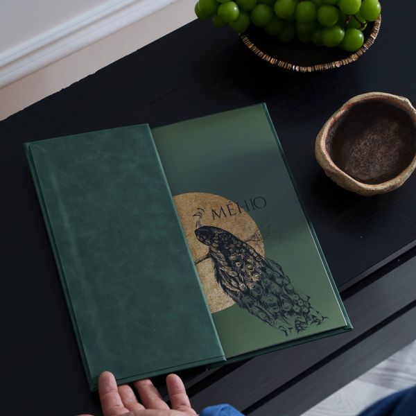 Папка меню изготовлена в глубоком изумрудном цвете, который подчёркивает изысканность заведения. На обложке логотип тиснён золотом, а тонкие линии по краям напоминают изящную рамку, приглашая открыть меню и погрузиться в гастрономическое путешествие.