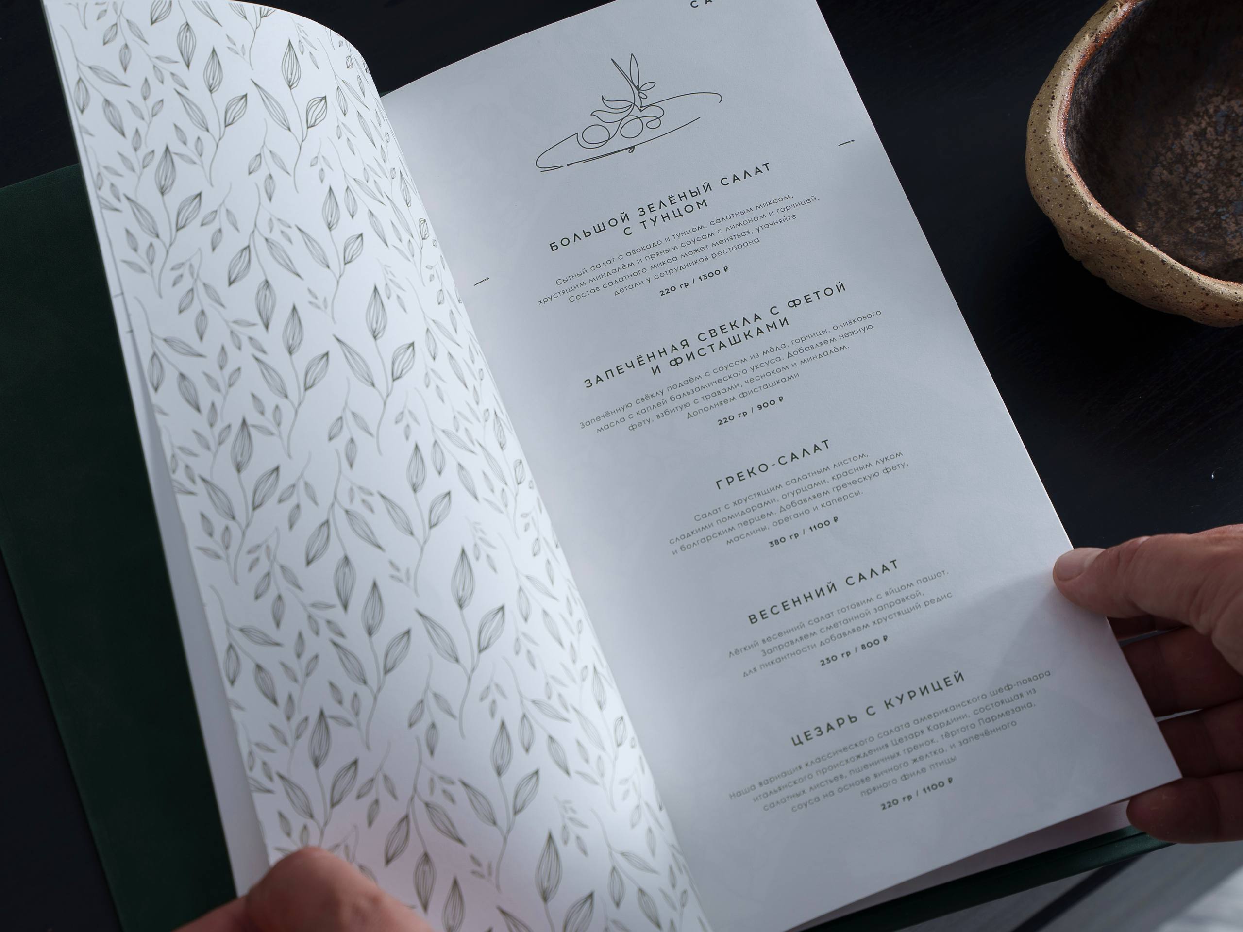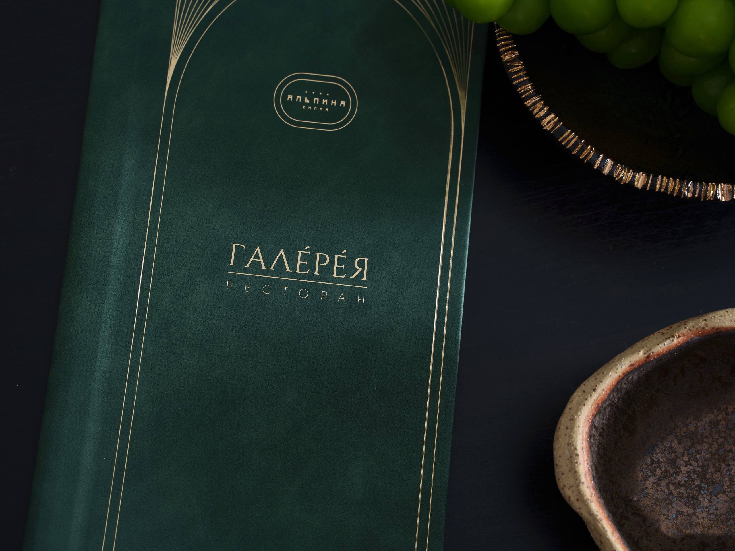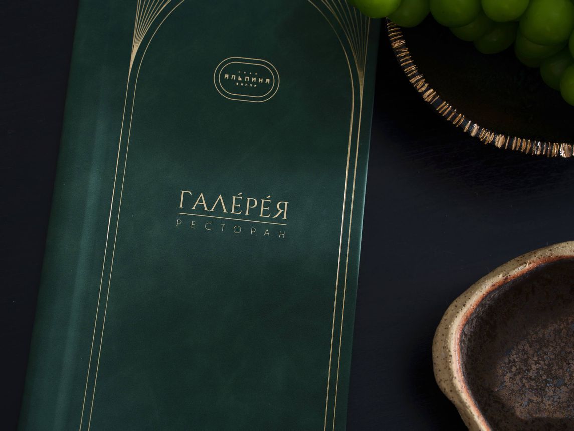 Папка меню изготовлена в глубоком изумрудном цвете, который подчёркивает изысканность заведения. На обложке логотип тиснён золотом, а тонкие линии по краям напоминают изящную рамку, приглашая открыть меню и погрузиться в гастрономическое путешествие.