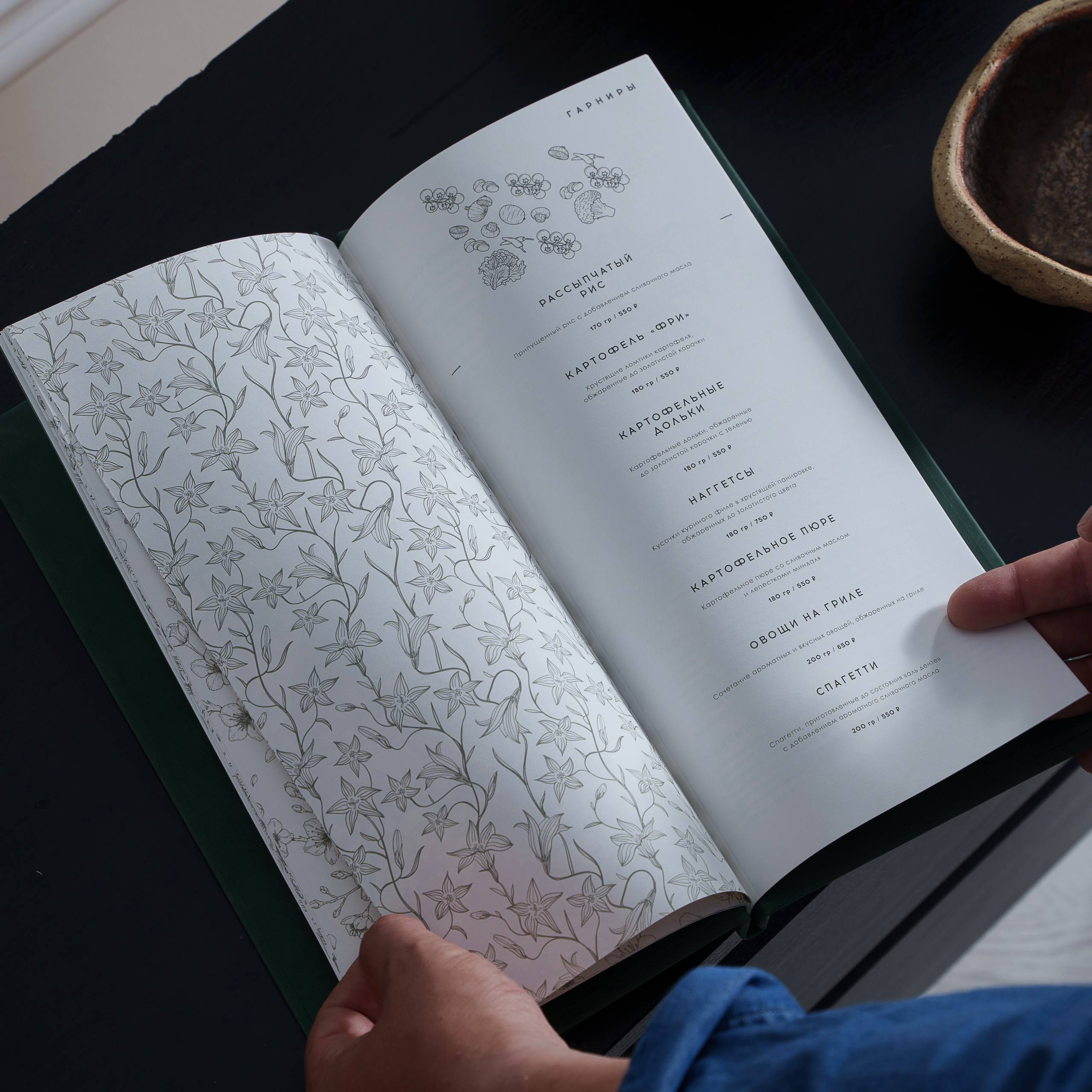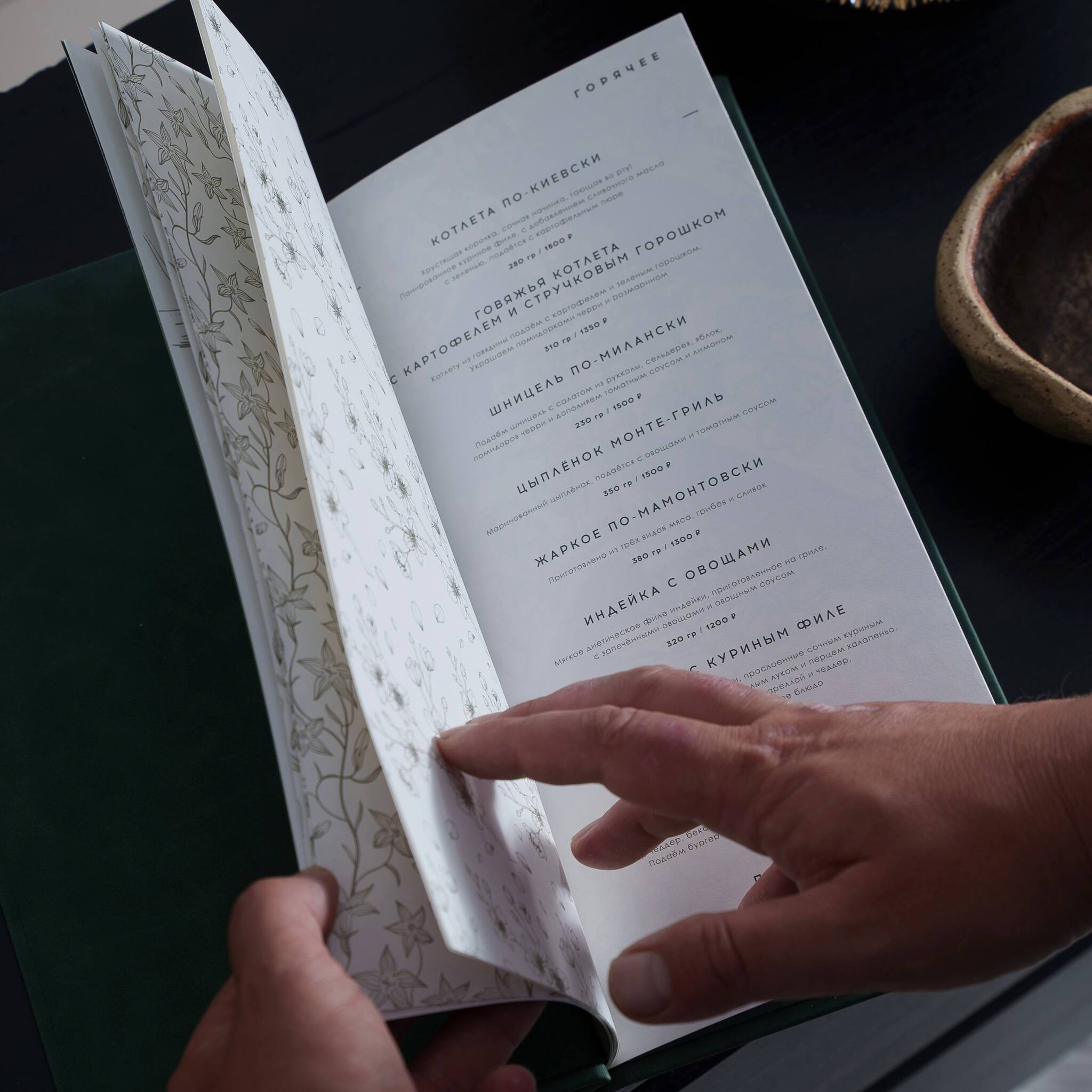 При открытии меню красуется павлин — символ красоты и величия, а каждую страницу украшает деликатный черно-белый цветочный узор, добавляющий нотки элегантности и утончённости в меню.